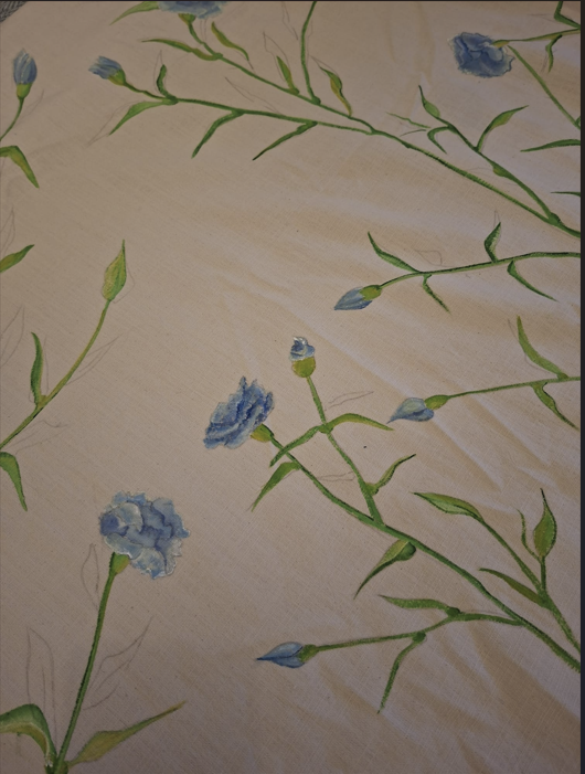 Pintura sobre tela con motivo floral de flores azules sobre fondo claro. Técnica pictórica con trazos suaves y delicados. Pieza artesanal única.