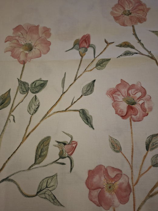 Pintura sobre tela con rosas en tonos rosas y rojos sobre fondo crema. Composición floral elegante pintada completamente a mano.